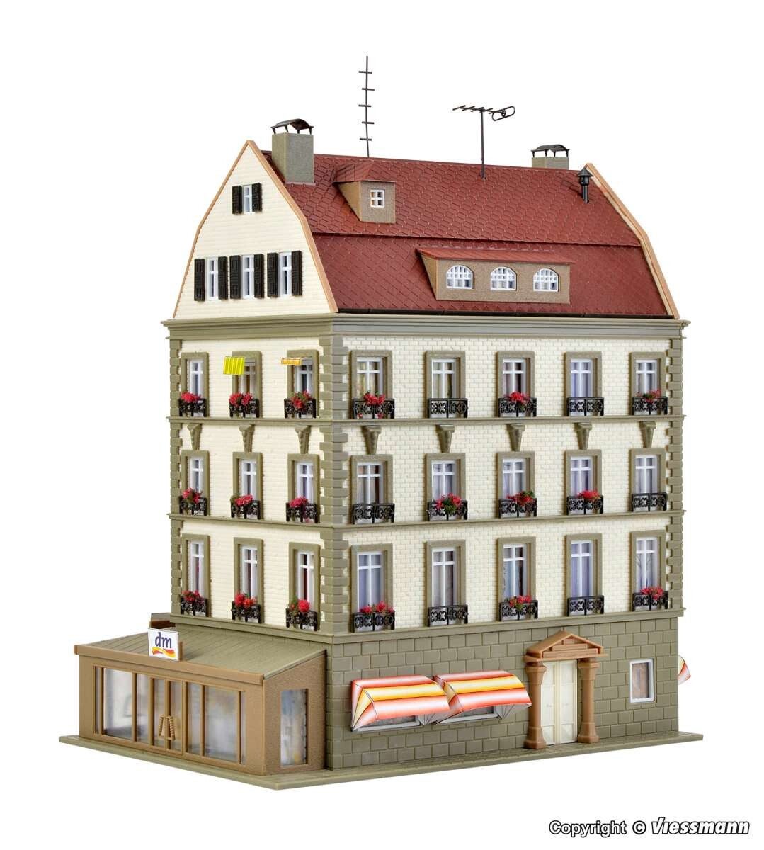 Produktinformationen "H0 dm-Drogeriemarkt" Im Erdgeschoss dieses stattlichen Wohnhauses befindet sich ein dm-Drogeriemarkt. Das Dachgeschoss ist ausgebaut und in der Mitte befindet sich eine kleine Dachterrasse. Die Fassaden prägen filigrane Eisengitterverzierungen. Wir danken dm für die freundliche Unterstützung. Maße: L 17 x B 12 x H 20,7 cm.