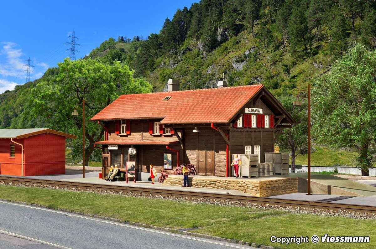 Produktinformationen "H0 Bahnhof Surava inkl. Hausbeleuchtungs- Startset" Funktionsbausatz. Die Station Surava liegt am Eingang zum Albulatal in der Schweiz. Die passende LED-Beleuchtung für ein Fenster liegt dem Bausatz bei. Sie ist einfach zu montieren und genau auf das Modell abgestimmt.