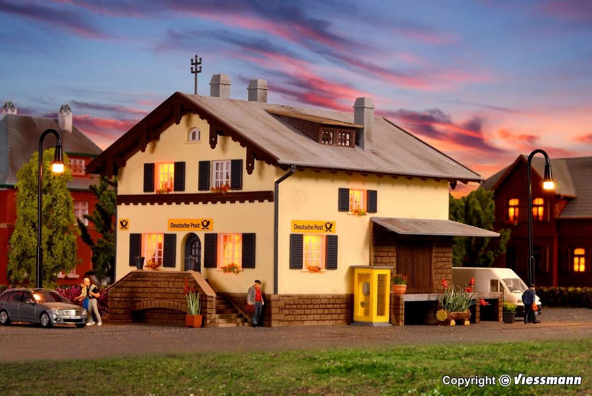 Produktinformationen "H0 Postamt" Bausatz. Dieses Postamt verfügt über eine kleine Verladerampe. So können schwere Sendungen bequem in die LKW verladen werden. Die beiliegende Telefonzelle erinnert an die guten alten Zeiten.