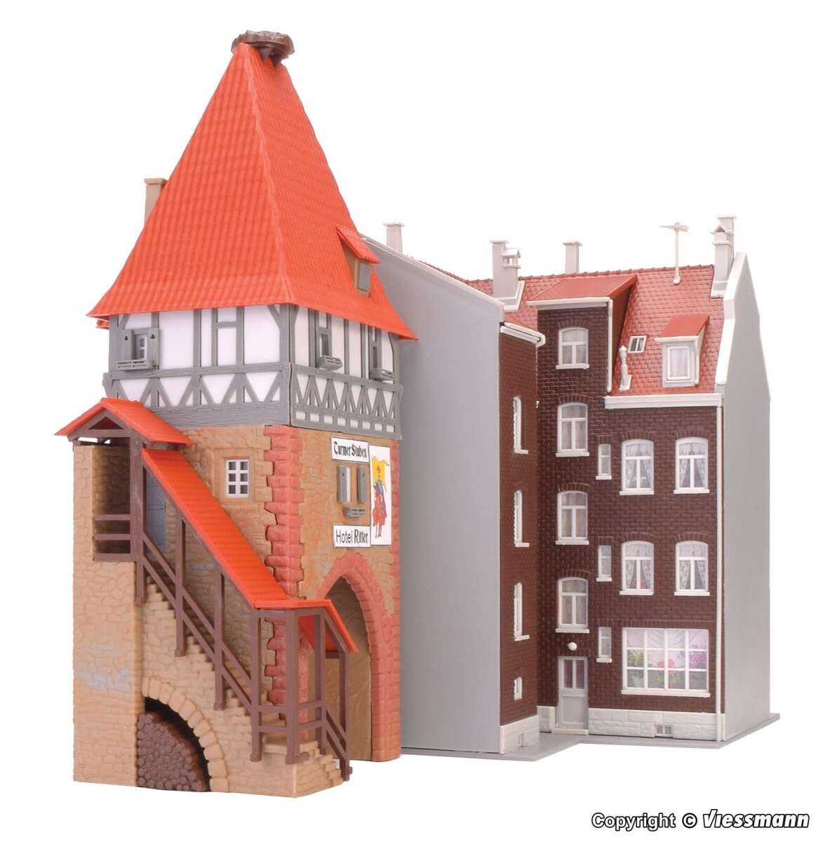 Produktinformationen "H0 Hotel Ritter mit Stadttor" Bausatz. Maße Hotel: L 16,4 x B 15,5 x H 17,5 cm. Stadttor: L 10,2 x B 8,5 x H 20,8 cm. Schwierigkeitsgrad: 2 (Fortgeschrittene).