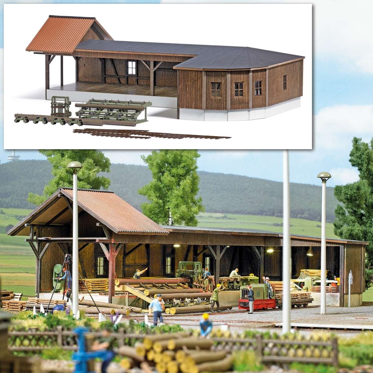Der Bausatz dieses Sägewerkes aus echtem Holz ist an eine bis vor kurzen noch in Betrieb befindliche Anlage im thüringischen Neumühle/Elster angelehnt. Das große Gebäude mit dem interessanten Eck-Grundriss ist reichhaltig ausgestattet: Baumstämme, Sägegatter und Zuführung für das Rundholz mit Rollwagen und Gleisen. Alle Teile fertig koloriert.