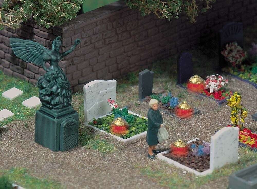 4 Grabsteine mit roten Grableuchten (LEDs) und 1 Engel-Statue. Ideal zur Ergänzung des Busch Friedhof-Sets 6049.