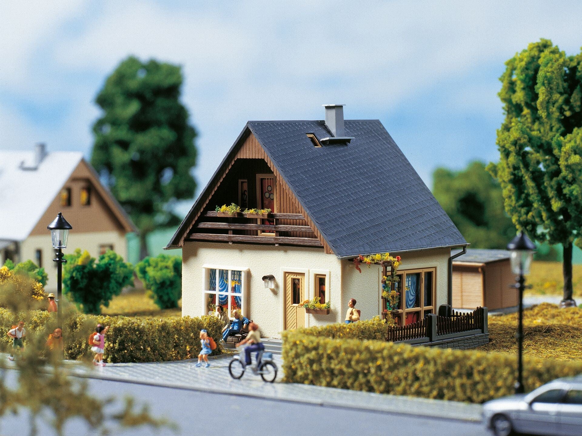 Einfamilienhaus mit großer Tür zur Terrasse, Blumenfenster, holzverkleideten Giebeln und Dachgaube, Loggia, Pergola, Terrassenzaun und Wasserfass sowie Blumendekomaterial. 100 x 82 x 93 mm
