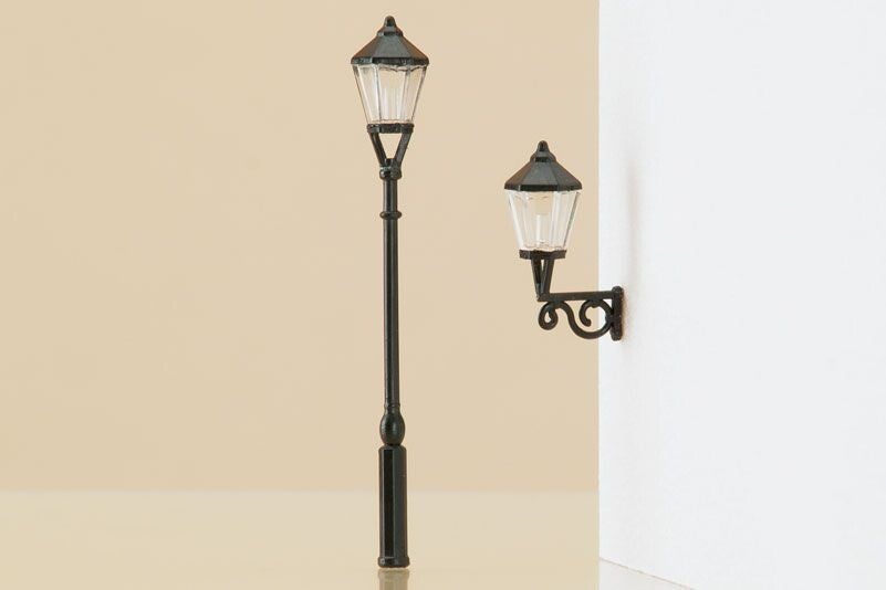 Sehr filigran. Für Szenen ab Epoche I. Sie können wahlweise 20 stehende oder 20 wandhängende Gaslaternenattrappen gestalten. Höhe 40 mm Ausladung 8 mm
