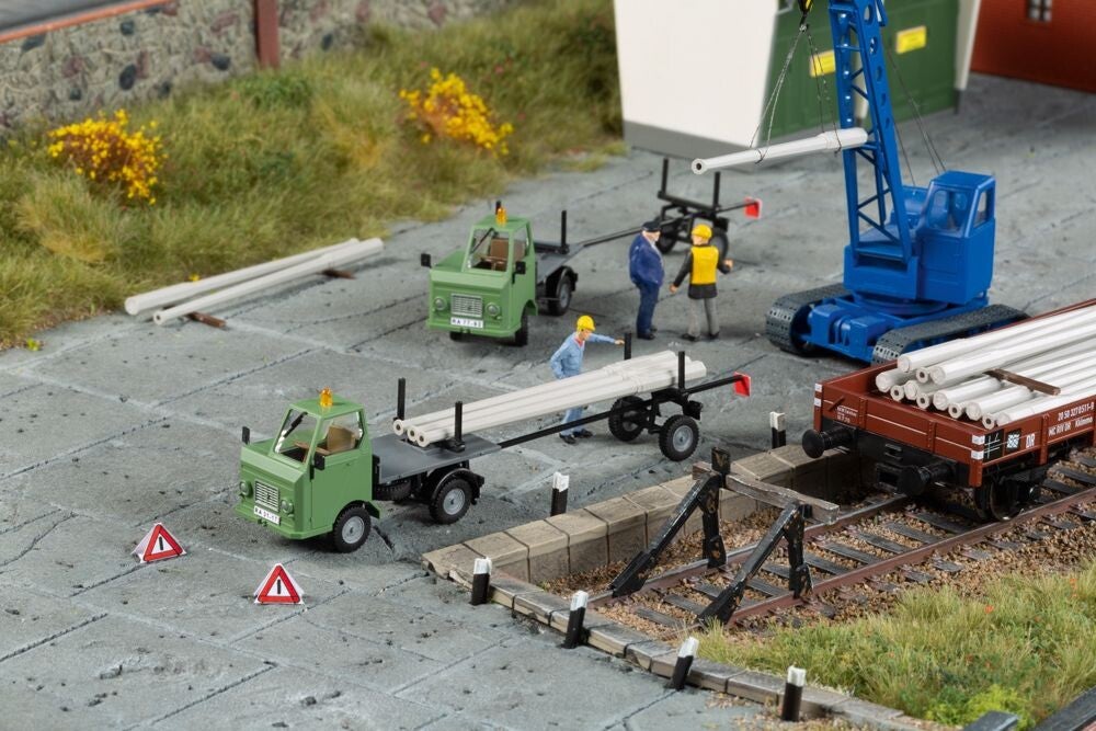 Bausatz. Zum sicheren Transport für lange Güter, in diesem Fall beiliegende Spannbetonmasten, bietet sich ein gezogener Nachläufer ideal an. Hier ruht die Ladung sowohl auf dem Drehschemel des bekannten Multicar M22 Modells als auch zwischen den Rungen des mit einer verstellbaren Zugstange verbundenen Nachlaufanhängers.