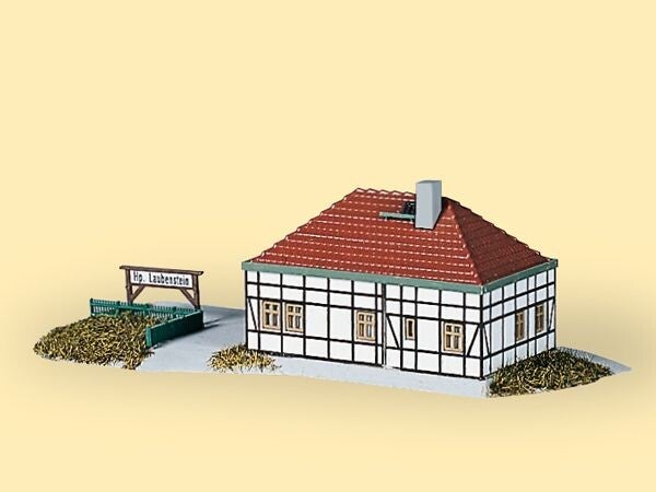 Kleines Gebäude mit Fachwerk, Bahnsteig, Haltepunktschild und Lattenzaun. Bei Gleisen mit Bettung, Höhe durch Unterbau ausgleichen. 174 x 72 x 58 mm