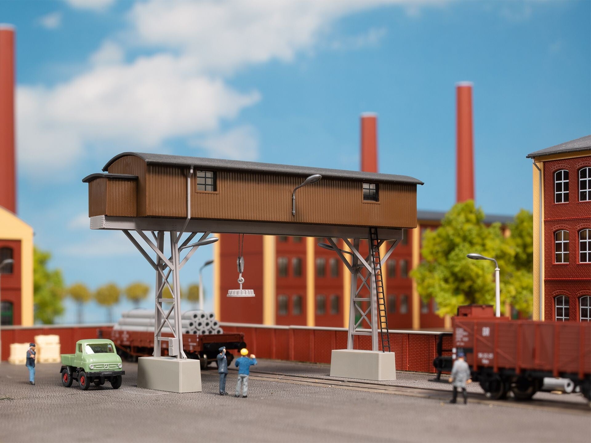 Mit einem Überladekran kann Ladegut von einem Waggon auf einen Lkw oder zwischen zwei Waggons umgeschlagen werden. Unser Modell hat eine stationäre Variante auf