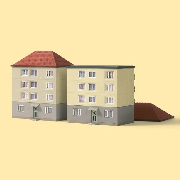 Die Architektur von Mehrfamilienhäusern in den Jahren um 1950 und 1960 war in ganz Deutschland ähnlich. Sie haben die Wahl! Dem Bausatz liegen je 2 Flachdächer und 2 Ziegelwalmdächer bei.