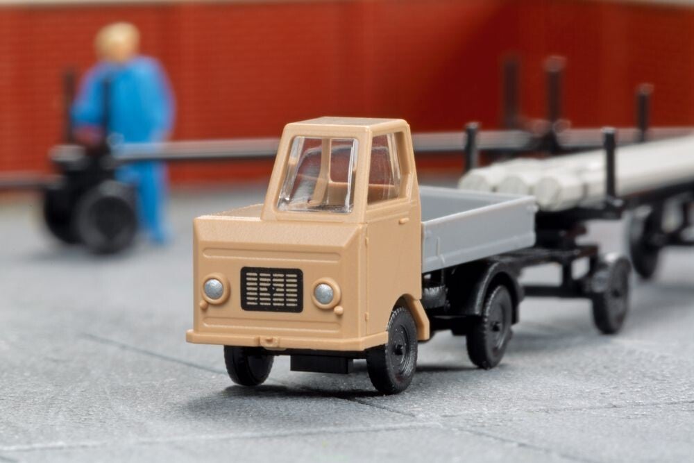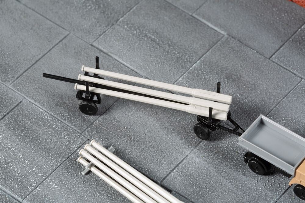 Bausatz. Das fein detaillierte und bedruckte Modell des Kleintransporters Multicar M22 zieht hier in einer neuen Farbgebung einen filigranen Langmaterialanhänger. Die beiliegende Ladung, bestehend aus Spannbetonmasten für die Straßenbeleuchtung, macht das Gespann zu einer guten Ergänzung des Modells 14 489 Transformatorenhäuschen.