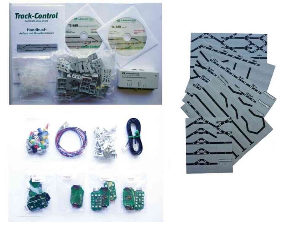 Das Basis-Set enthält alle Artikel, die zur Grundausstattung gehören und pro Stellpult nur einmal erforderlich sind: ein Anschlussmodul, ein Anschlusskabel und ein LocoNet-Kabel, eine CD mit dem Planungsprogramm und das Handbuch.