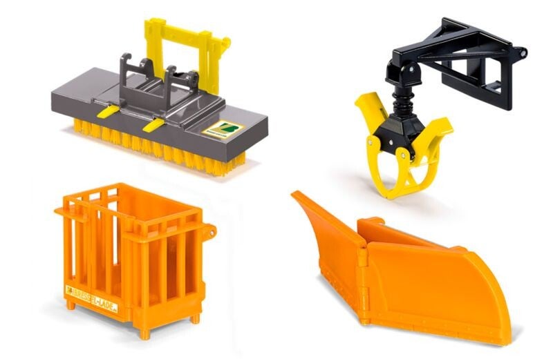 Die Serie der Anbaugeräte für SIKUFARMER32-Traktoren mit Frontlader wird mit diesem außergewöhnlichen Set fortgesetzt. Es besteht aus Arbeitsplattform, Schneeschild, Kehrbesen und einem Baumstammgreifer. Die Arbeitsplattform ist zusätzlich noch mit einer Tür ausgestattet. Das Schneeschild ist nach rechts und links beweglich und der Baumstammgreifer hat ein pendelnd aufgehängtes Greifelement. Die Besonderheit des Kehrbesens ist die mitgelieferte Palettengabel. Mit dieser kann der Besen aufgenommen werden. Die Zinken der neuen Palettengabel des Frontladertraktor Fendt 939 Vario (#6778) aus der SIKUCONTROL Serie passen ebenfalls in die Aufnahmen am Kehrbesen.