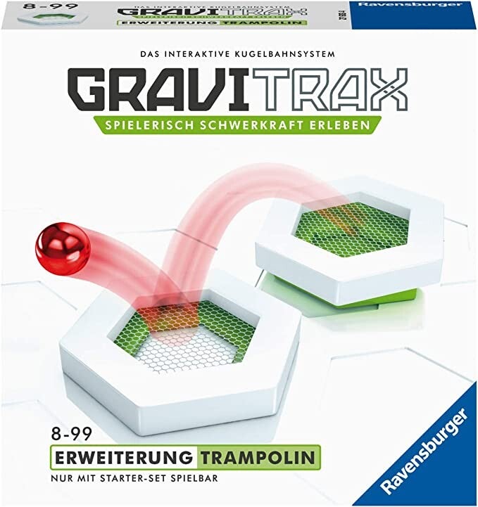 Das Trampolin trotzt der Schwerkraft und lässt die Kugel imposant durch die Bahn hüpfen. Kombiniert mit einem GraviTrax Starter-Set bringt dies noch mehr Action in die spannende Welt der Kugelbahn. Wie weit und hoch springt die Kugel auf dem Trampolin durch die Bahn?