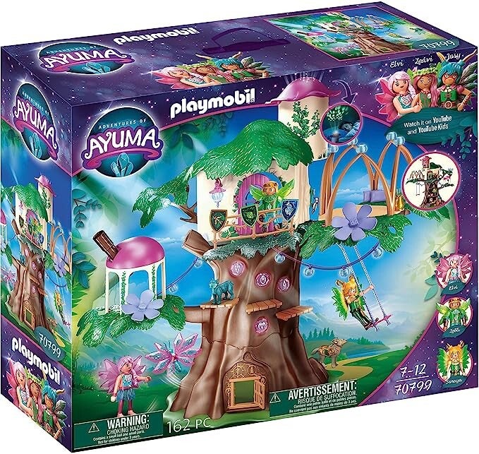 Tief im verwunschenen Feenwald steht der geheimnisvolle Gemeinschaftsbaum. Er ist nicht nur Wohnort der Feen, sondern auch sicherer Rückzugsort der magischen Wesen und ihrer befreundeten Seelentiere. Jede Feenart ist mit ihrem Symbol auf dem Gemeinschaftsbaum vertreten. Für fröhliche Plauderstunden treffen sich die Feen im gemütlichen Gemeinschaftsraum. Zum Beobachten der Sterne nutzen sie das Fernrohr des Observatoriums. Auf der seitlichen Holzplattform lädt der filigrane Pavillon mit seinen nachleuchtenden Lampions und kuscheligen Kissen und Decken zum Träumen ein. Im Turm des Gemeinschaftsbaumes befindet sich ein Sternenprojektor mit welchem ein zauberhafter Sternenhimmel an die Zimmerdecke projiziert werden kann. Die treuen Seelentiere haben unter der Baumwurzel einen lauschigen Unterschlupf. Hier ist ausreichend Platz, um zu fressen, zu spielen und sich auszuruhen. Das Spielfigurenset enthält eine Crystal Fairy mit Kristallschmetterling, eine Knight Fairy mit Wolf, einen Forest Fairy-Mann mit Luchs, einen Gemeinschaftsbaum mit drei Ebenen - Küche, Gemeinschaftsraum und Baumwurzel sowie Pavillon, Turmzimmer, Observatorium mit Fernrohr, Sternenprojektor und viele weitere Extras.