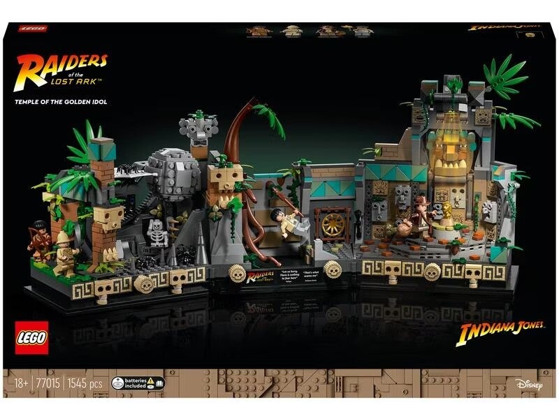 - LEGO Indiana Jones Tempel des goldenen Götzen Bausatz, der die spannende Eröffnungsszene aus dem Film Jäger des verlorenen Schatzes zeigt.