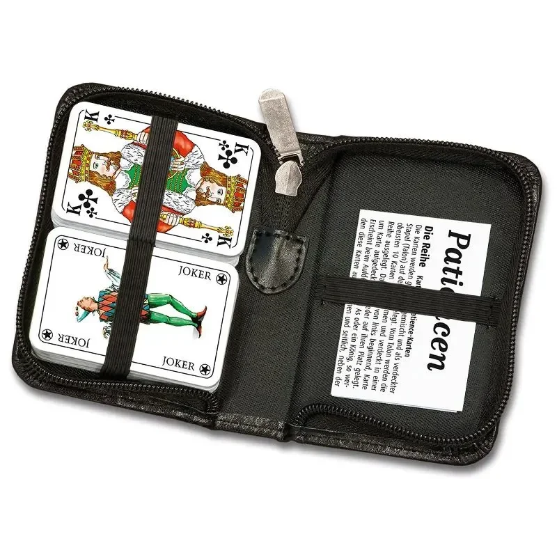 Das perfekte Spiel für 1 Person. 2 x 55 Spielkarten inkl. 2 x 3 Joker. Französische Karten im Format 43 x 67 mm. Mit Spielanleitung in deutsch. Im schönen Reiseetui aus Kunstleder. Format Etui: 115 x 80 x 35 mm. Patience stammt vom französischen patience und bedeutet Geduld. Geduld wird bei diesem Spiel auch benötigt und dient oft zur Meditation und hilft, vorausschauendes Denken zu trainieren. In dem praktischen Etui mit Reisverschluss können die Karten gut verstaut werden und eignen sich auch gut für die Reise