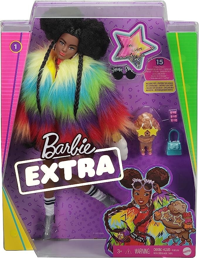 MATTEL BARBIE - Extra Puppe, kuscheliger Regenbogen-Mantel mit Pudel, brünetten Afro-Puffs GVR04