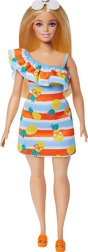 - Die Barbie-Puppe weist die Körperformen und das blonde Haar des Originals auf. Diese Puppe in ihrem wunderschönen, mit tropischen Motiven bedruckten Sommerkleid mit seidigem pinkfarbenem Band um die Taille ist bestens auf den Sommer vorbereitet.
