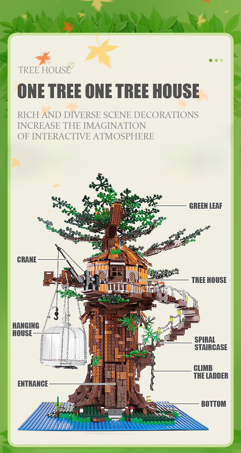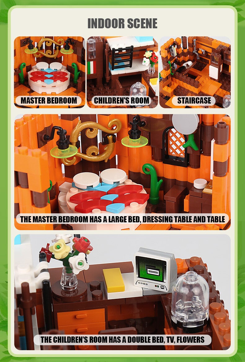- Details: Das Baumhaus-Set enthält einen riesigen Baum, ein Baumhaus, eine kleine Hütte, eine hängende Transprant-Hütte, einen manuellen Kran, eine Wendeltreppe, eine Leiter und abnehmbare Blätter. Es gibt ein Schlafzimmer mit einem großen Bett für zwei Personen, einem Schminktisch usw. Das Kinderzimmer verfügt über ein Etagenbett, einen Fernseher und einen Blumenstrauß. Die grünen Blätter sind abnehmbar, Kirschblüten und Herbstlaubpackung Nr. 16033D sind separat erhältlich.