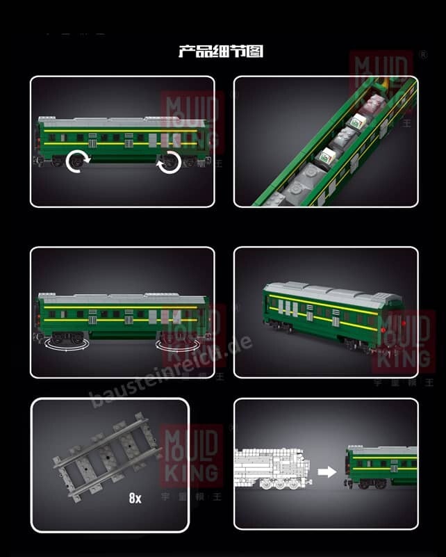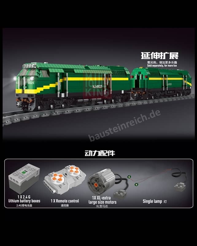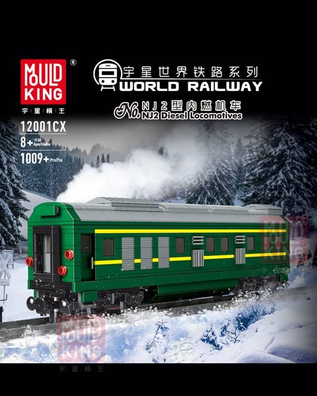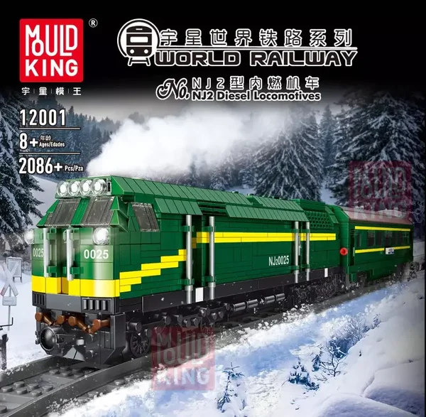 Das Set mit der Nummer Mould King 12001 ist die grüne Diesel-Lokomotive mit Wagons. Sie ist Teil der neuen World Railway Serie. Der Zug besteht aus 2086 Teilen und es sind Power Functions mit in der Box dabei. Zu dem Zug gibt es die Möglichkeit separate Anhänger zu kaufen. In der Box der Diesel Lok befinden sich Gleise.