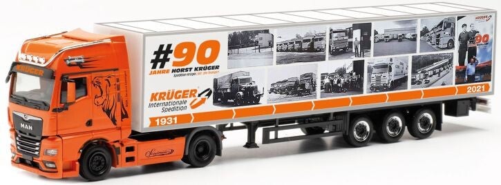 Das 1929 von Werner Krüger in Pommern gegründete Unternehmen musste den Betrieb 1940 aufgrund kriegsbedingter Beschlagnahmung wieder einstellen. Die Neugründung erfolgte 1948 in Imbshausen bei Northeim, die Umsiedlung nach Göttingen erfolgte 1951. Seit nunmehr über 60 Jahren am gleichen Standort wird das Familienunternehmen in dritter Generation geführt. Mitten in Deutschland gelegen wird ein moderner und umweltfreundlicher Fuhrpark, sowie über 48.000 m² Lager- und Logistikfläche auf 140.000 m² eigenem Grundstück unterhalten. Der Auflieger trägt die Beschriftung zum 90-jährigen Bestehen im Jahr 2019.