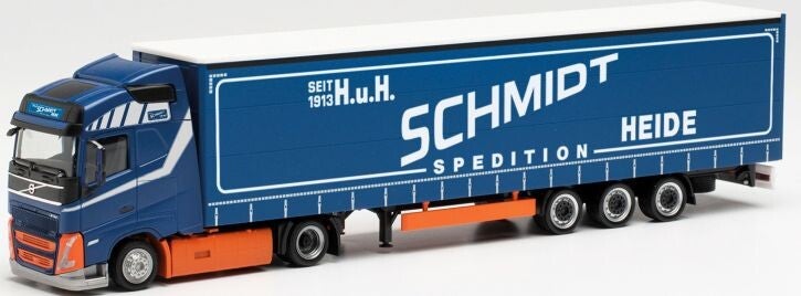 Die Firma H. & H. Schmidt aus Heide in Schleswig-Holstein setzt neben Tiefladezügen für Spezialtransporte auch Planenauflieger als Lowliner ein. Herpa produziert von dieser Spedition einen aktuellen, zweiachsigen Volvo der neuen Baureihe mit einem dreiachsigen Lowliner-Auflieger.