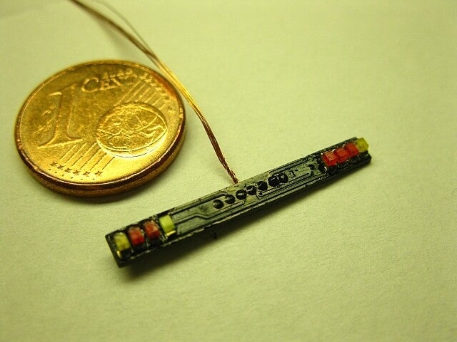 Das Modul wird einfach an eine vorhandene Stoßstange eines H0 LKW Modells geklebt. Der dünne Kupferlackdraht wird an die Lötkontakte vom Rückleuchtenträger gelötet und unauffällig in den LKW Aufbau geleitet.