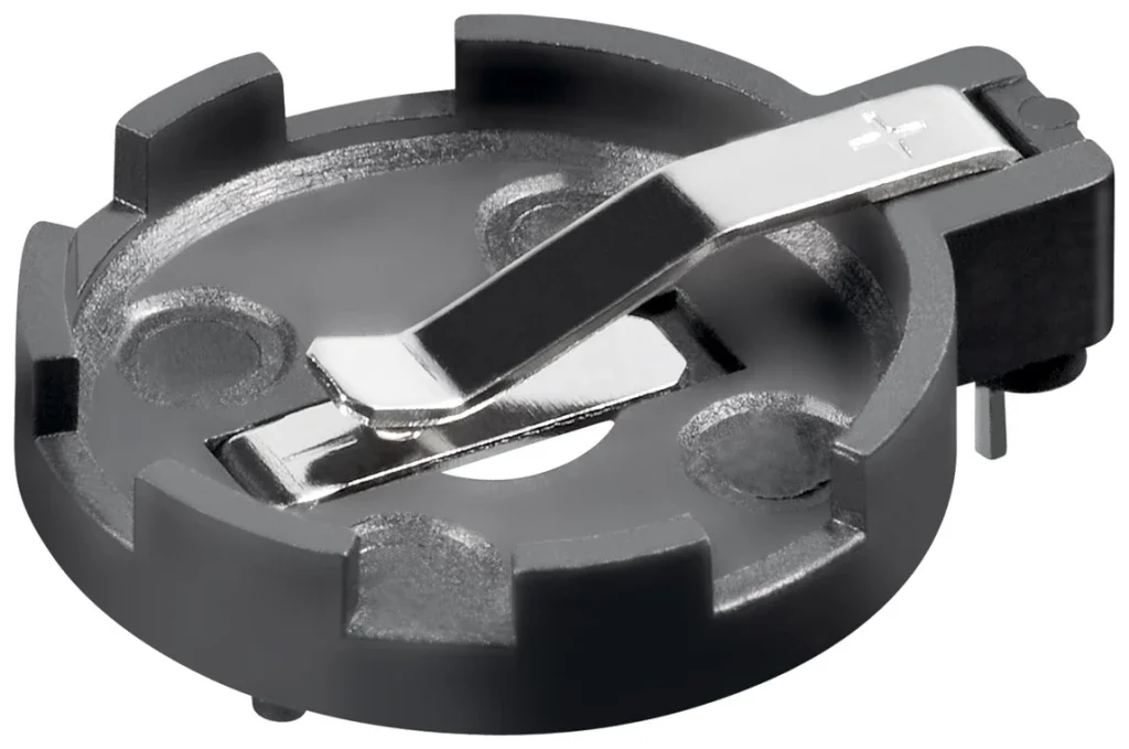 2-Pin Knopfzellenhalter in schwarz für Knopfzelle CR2012 - CR2032, für horizontale Printmontage.