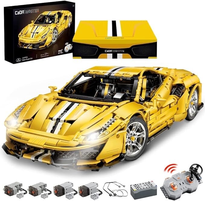 - CaDA C61057W Italienische Supercar-Modellbausteine, basierend auf dem Prototypendesign des 488 Pista-Automodells, hergestellt vom berühmten ausländischen MOC-Spieler bruno, das genaue Verhältnis beträgt 1:8, das Netzteil enthält eine 7,4 V Lithium-Batteriebox * 1 , Fernbedienung*1, L Power Motor pro*2, Servomotor pro*2, LED-Beleuchtungsgruppe*2.