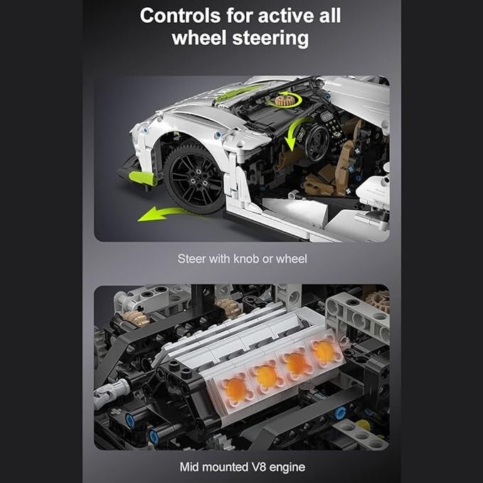 - Das Lenkrad ist mit der Lenkung des Autos, dem hinten montierten simulierten V8-Motor, dem stufenlosen CVT-Getriebe mit 9 Gängen verbunden, und die Gänge werden durch die schwankende Stangenposition geschaltet. der Sportwagen kann Hinterradlenkung realisieren. Einstellbarer Spoiler, simulierte Aufhängungsdämpfung.