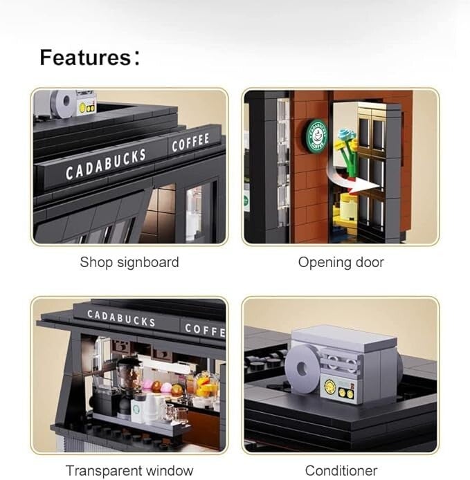 - CaDA C66005W Kaffeehaus-Baustein. In Anlehnung an den architektonischen Stil des Cafés sind die meisten Innendetails durch das Glas zu sehen. Wie die Kasse: Kaffeemaschine, Dessert, Kaffeebohnen, Menükatalog, langer Tisch, Topfpflanzen, Kaffeetassen usw., die die Atmosphäre des Cafés vollständig widerspiegeln.