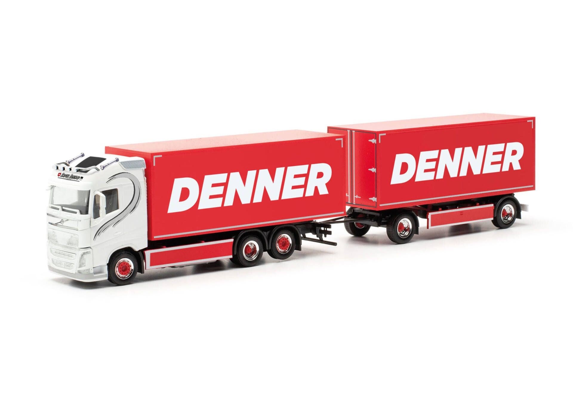 Sascha Berthold hat seine Spedition im schweizerischen Mitten, in Kanton Graubünden. Neben den LKWs mit Eigenwerbung fährt Sascha Berthold auch für den Schweizer Discounter Denner. Nach dem Sondermodell für den Schweizer Handel im Sommer (Art.Nr. 952415) erscheint nun dieser weiße Volvo als Hängerzug mit Festaufbauten. Wie in der Schweiz nicht unüblich ist der Koffer des Hängers mit Türen hinten und vorne bestückt, sodass ohne abzukuppeln durchgeladen werden kann. Das erspart dem Fahrer einige an Zeit beim Auf- und Abladen. Das Modell erscheint in einmaliger Auflage.