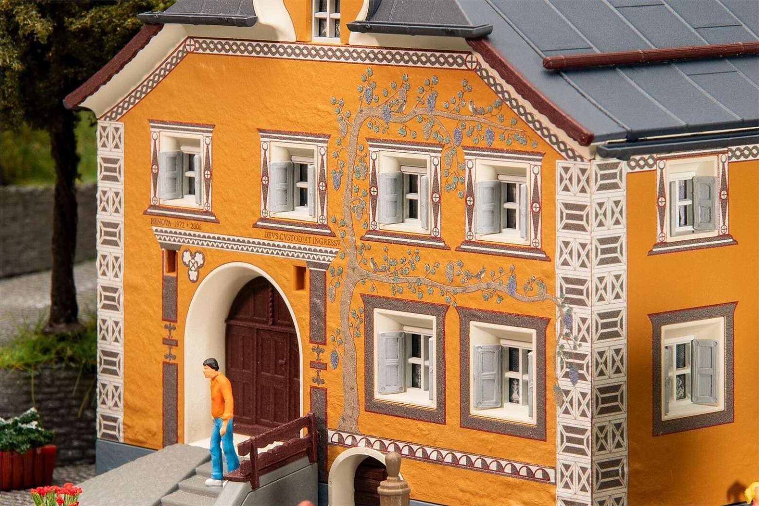 Auf in das wunderschöne und von bäuerlichen Traditionen geprägte Engadin in der Schweiz. Inspiriert von einem Original in Ardez im Unterengadin verkörpert dieses Modellhaus die typische Architektur. Seine imposante Steinmauer, kunstvoll verziert mit der aufwendigen Sgraffito-Technik, besonders im vorderen Teil des Gebäudes, verleiht dem Gebäude einen einzigartigen Charakter. Mit seinen tiefen Fensterfluchten und den beiden Eingangstoren, die in den Sulèr (Arbeitsraum) und den Stall führen, ist das Engadiner Traditionshaus als Wohnhaus konzipiert.