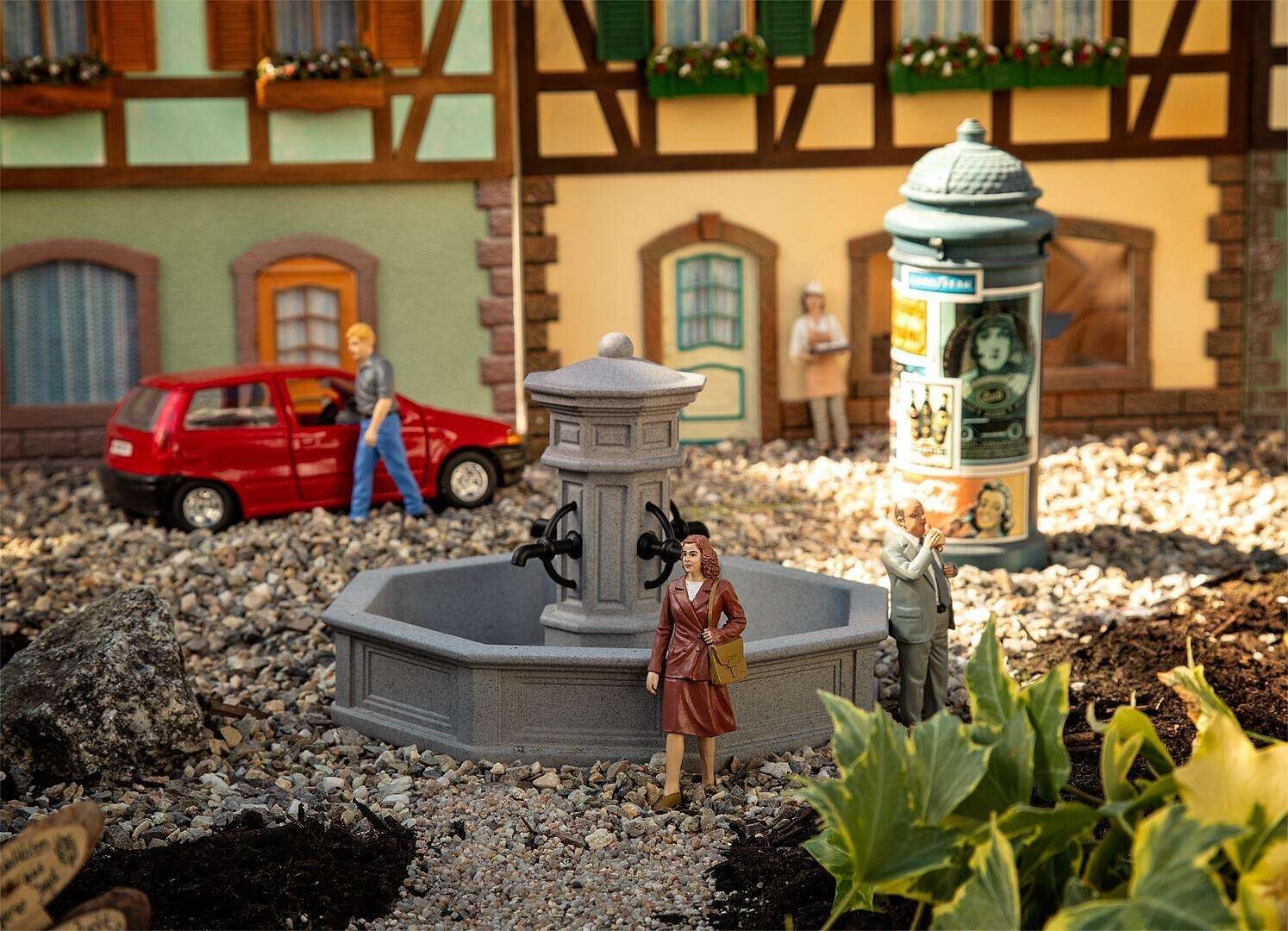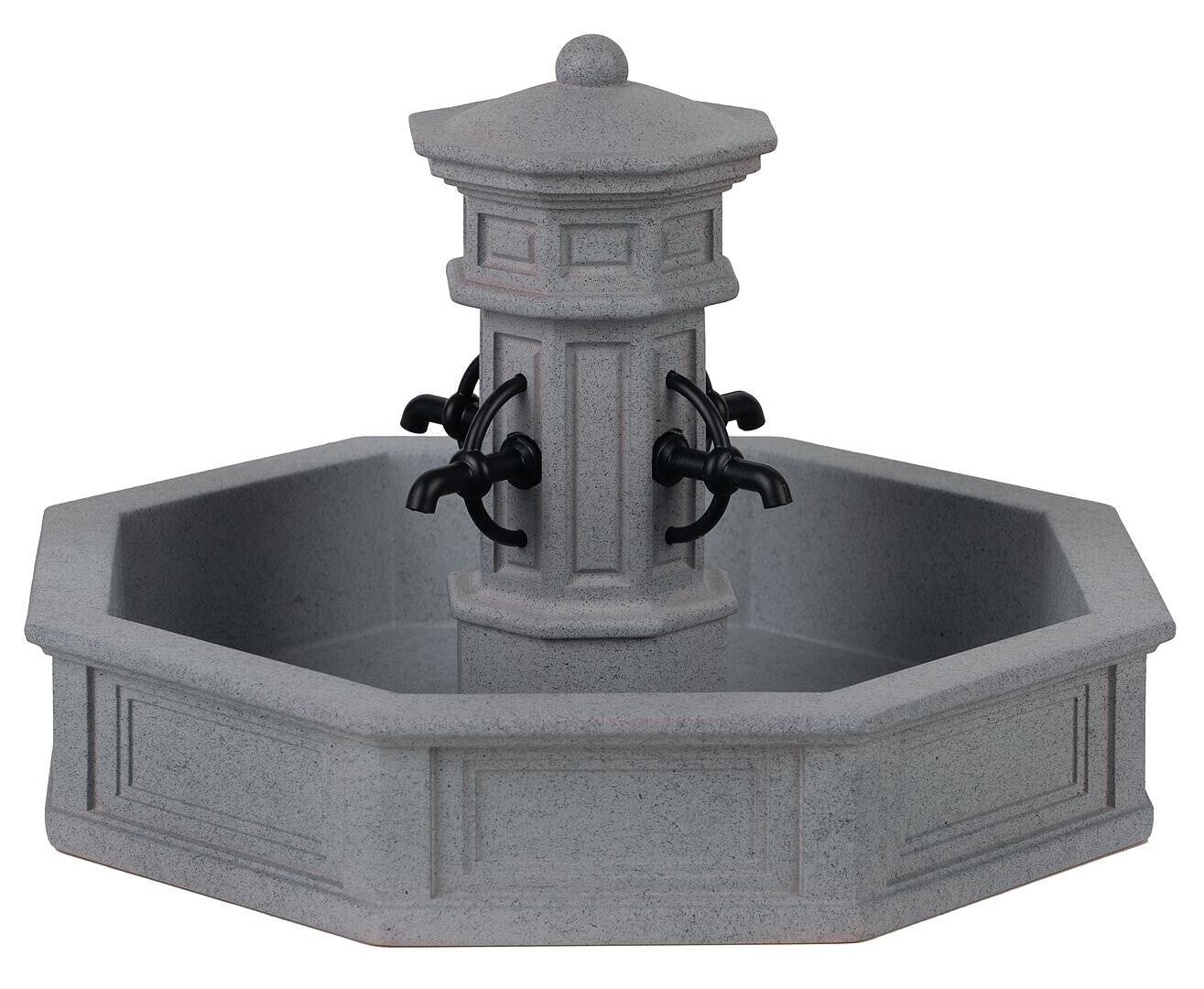 Marktplatzausschmückung! Granitgrauer Marktbrunnen mit mittiger Brunnensäule und vier Hähnen. Bausatz aus einem Material-Mix aus Resin und Kunststoff. Modell ohne Funktion.