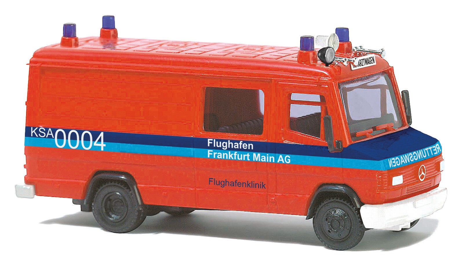 Feuerwehrroter Notarztwagen (NAW) der Flughafenfeuerwehr im hessischen Frankfurt im Design der späten 1980er bzw. frühen 90er Jahre mit mittelblau/dunkelblauer Bauchbinde. (Siehe auch Pendant Mercedes-Benz VF 123 Miesen »Feuerwehr Fraport Frankfurt« / Art.-Nr. 52223)