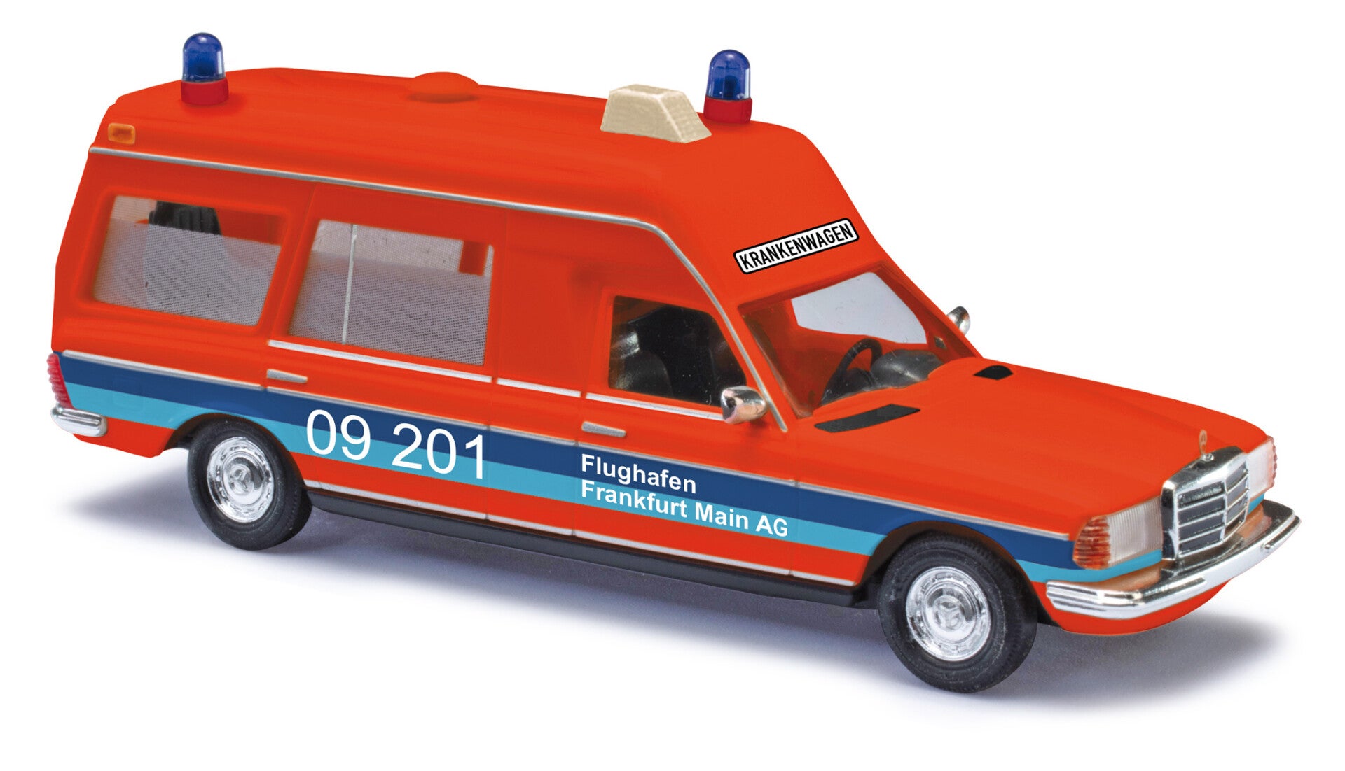 Fraport hat alles im Griff! Der feuerwehrrote Krankenwagen mit der markanten hell- und dunkelblauen Bauchbinde im Stil der 80er-Jahre stand im Dienste des Frankfurter Flughafens. (Siehe auch Pendant Mercedes-Benz 507 »Feuerwehr Fraport Frankfurt« / Art.-Nr. 44302)