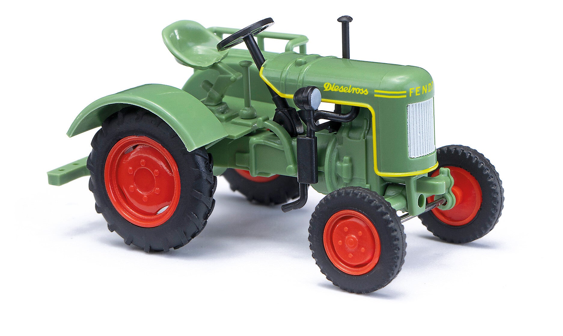 Die 1:87er Miniatur gibt das Modellbaujahr 1951 wieder und besticht durch seine Filigranität. Markant ist der große, stark gerillte Kühlergrill mit dem »Fendt«- Dieslross-Schriftzug und dem superfeinen gelben Zierstreifen.
