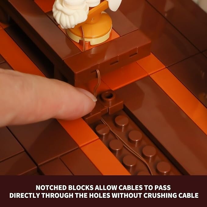 - Gebäude-Details: Das Gebäude mit dem dunkelorangenen Dach kann bis zur Rückwand geöffnet oder aus dem dritten Stock herausgehoben werden, um die innere Waffenkammer, das Rathaus und den Wohnsitz des Aufsehers im obersten Stockwerk zu sehen. Die Gebäude mit apricotfarbenem Dach können durch Öffnen der Rückwand geöffnet werden, um den Arbeitsplatz des Bäckers und das private Schlafzimmer des Kaufmanns zu sehen.