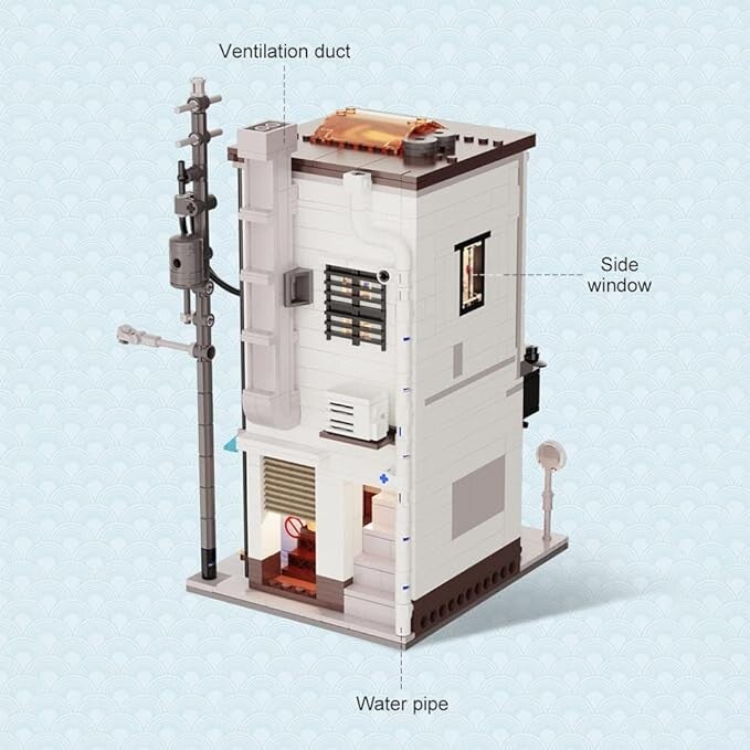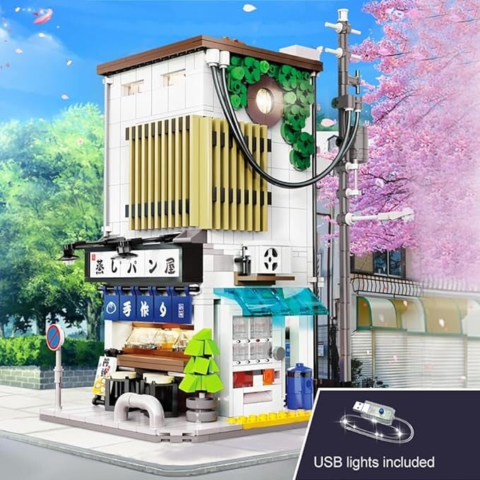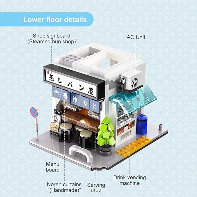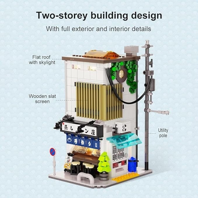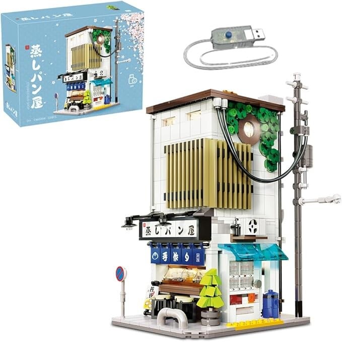 - C66006W Brötchenladen im japanischen Stil, das Gebäude ist in obere und untere Stockwerke unterteilt, der erste Stock ist ein Geschäft und der zweite Stock ist ein Privathaus; es hat ein eigenes Beleuchtungsmodul und die Lichtatmosphäre ist intensiver. Lichtspiel: Das LED-Beleuchtungsset verfügt über acht Lampenperlen, die über die USB-Schnittstelle eingeschaltet werden können und die Lichteffekte steuern.