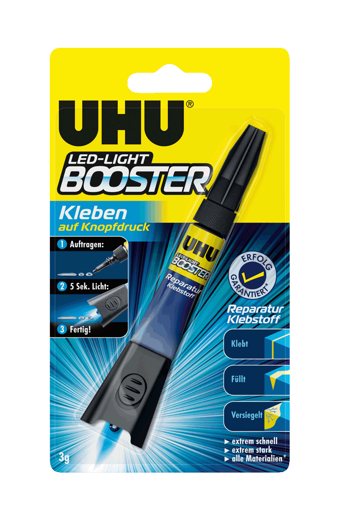 Extrem schneller und extrem starker Reparatur-Klebstoff, der mit Hilfe der speziellen LED-Lampe auf Knopfdruck klebt. Sobald die einzigaertige Klebstoffformel mit dem blauennlicht der LED-Lampe aktiviert wird, härtet sie binnen weniger Sekundennkomplett aus. UHU BOOSTER klebt, fülltnund vertsiegelt Materialien aller Art. Im Vergleich zu herkömmlichen Sekundenkleber zeichnet sich der Klebstoff durch exzellente Füll-eigenschaften aus, sodass die Klebeflächen nicht deckungsgleich sein müssen.