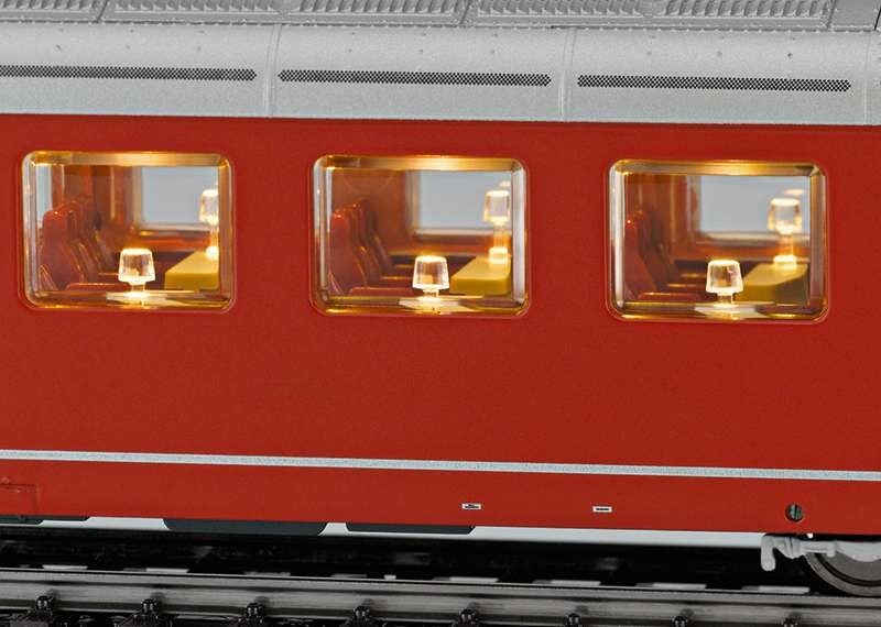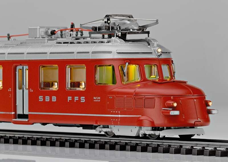 Modell: Mit Digital-Decoder mfx+ und umfangreichen Geräusch- und Lichtfunktionen. Geregelter Hochleistungsantrieb mit Schwungmasse. Über Kardan werden die beiden Achsen im äußeren Drehgestell am Fahrzeugteil 1 angetrieben. Haftreifen. Schweizer Lichtwechsel, Dreilicht-Spitzensignal und 1 weißes Schlusslicht konventionell in Betrieb, digital schaltbar. Spitzensignal umschaltbar auf 1 rotes Schlusslicht. Zusätzlich rotes Fahrberechtigungssignal (Falschfahrsignal) jeweils in Fahrtrichtung vorne, digital schaltbar, mit der Fahrtrichtung wechselnd. Serienmäßig eingebaute Innenbeleuchtung konventionell in Betrieb, digital schaltbar. Führerstandbseleuchtung jeweils separat digital schaltbar. Tischlampen digital schaltbar. Beleuchtung mit wartungsfreien warmweißen und roten Leuchtdioden (LED). Vier Drehgestell-Blenden liegen zum Austausch für den Einsatz auf großen Radien oder für die Vitrine bei. Gesamtlänge über Puffer ca. 53 cm.