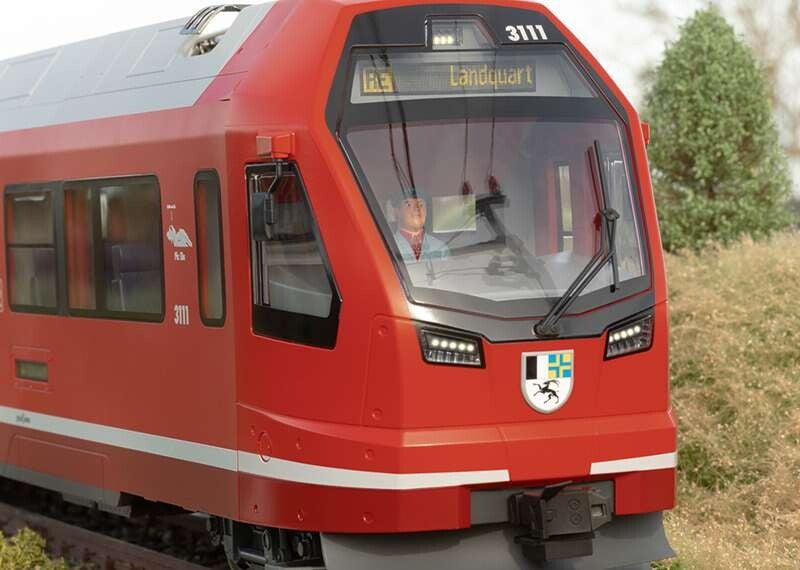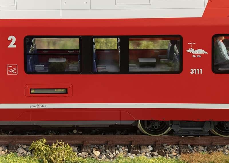 Modell des Triebwagens und Steuerwagens des Triebzuges der Baureihe ABe 4/16 "Capricorn" der RhB. Originalgetreue Farbgebung und Beschriftung der Epoche VI. Angetrieben mit zwei kugelgelagerten Hochleistungsmotoren auf 4 Radsätzen, Haftreifen. Ausgerüstet mit einem mfx/DCC-Decoder mit vielen Sound- und Lichtfunktionen wie mit der Fahrtrichtung wechselndem Spitzenlicht, Innenbeleuchtung sowie im Digitalbetrieb schaltbarer Beleuchtung der Zugzielanzeigen und des beleuchteten Wappens von Graubünden. Fahrgeräusch auch im Analogbetrieb funktionsfähig. Pantographen auf dem Triebwagen digital ferngesteuert heb- und senkbar. Viele angesetzte Details, wie Leitungen, Steckdosen, Scheibenwischer, Antennen und Rückspiegel. Die beiden Fahrzeuge können mit den beiden Mittelwagen 33100 und 33150 zu einem vorbildgetreuen vierteiligen Zug ergänzt werden. Länge über Puffer 153 cm.