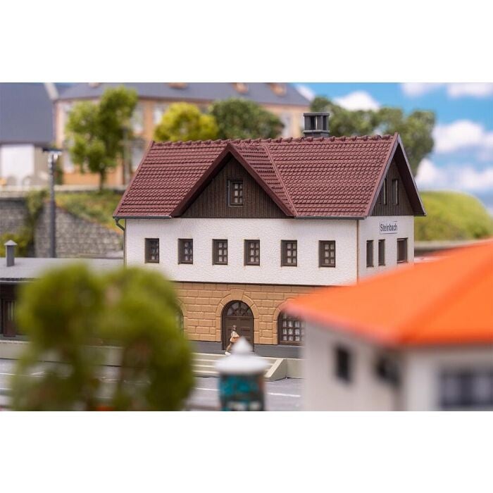 Kleiner charmanter Bahnhof mit Toilettenhäuschen und hölzernem Anbau. Hervorragend geeignet, um eine kleine Stadt mit einem Bahnhof auszustatten. Der Bausatz besteht aus einem Materialmix aus Kunststoff und Holz/Spezialkarton.