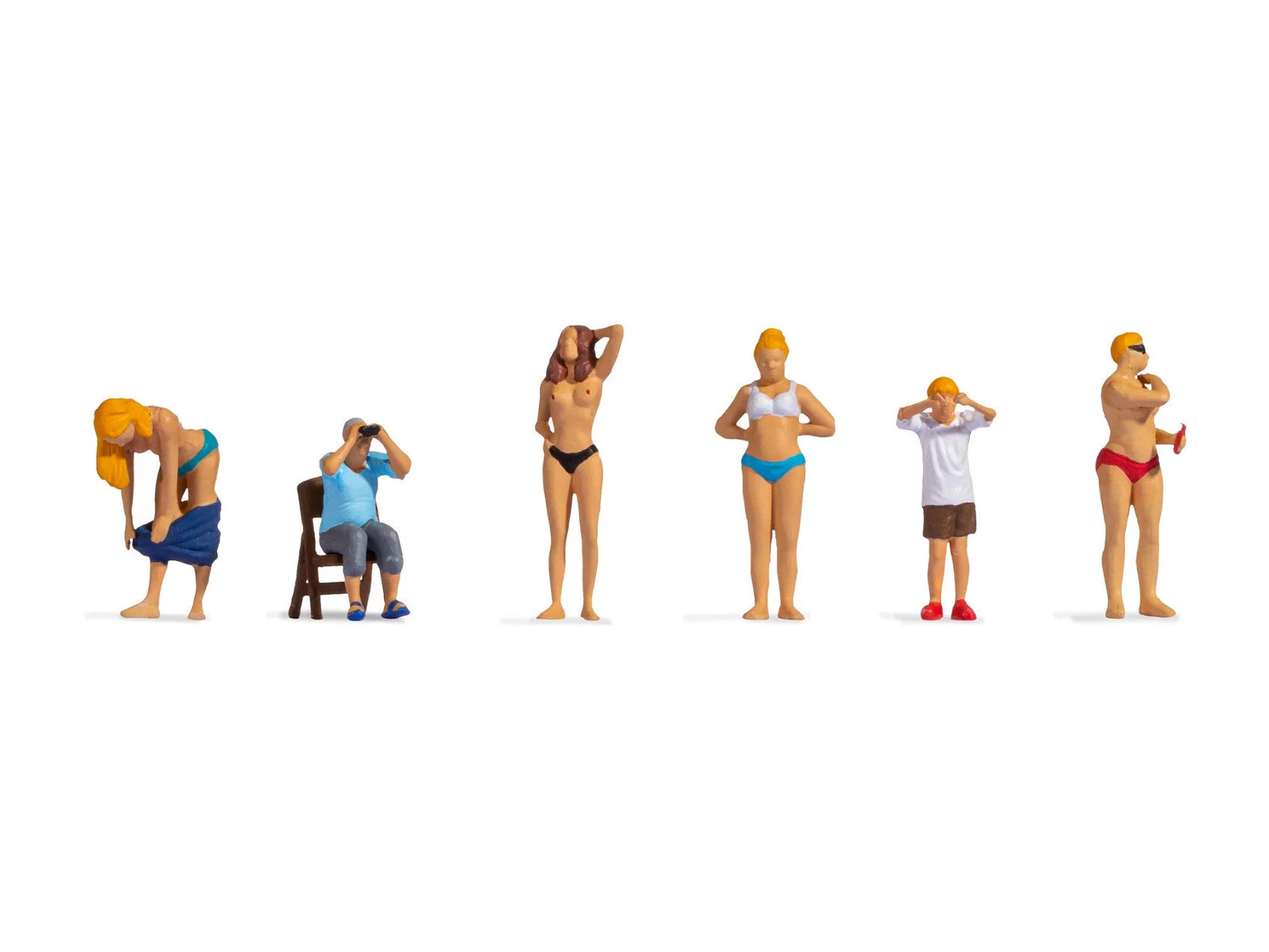 Das Figuren-Set "Voyeure" beinhaltet 6 Miniaturfiguren. 4 der weiblichen Figuren sind leicht bekleidet mit einem Bikini. Eine der Frauen bückt sich nach unten und zieht ein blaues Kleidungsstück aus. Im Set ist außerdem noch ein Kind enthalten, dass sich die Augen zuhält. Ebenfalls enthalten ist ein Mann, der auf einem Stuhl sitzt und durch ein Fernglas das Geschehen beobachtet.