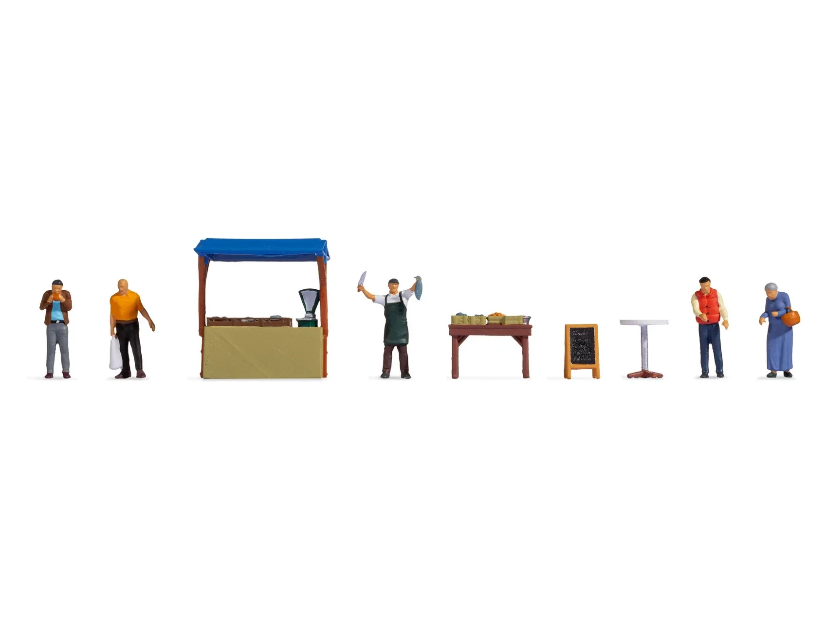 1 Figur "Fischverkäufer Akindo", 4 Figuren, 1 überdachter Fischstand mit Waage, 1 Markttisch mit Auslage, 1 Imbisstisch,1 Werbeschild