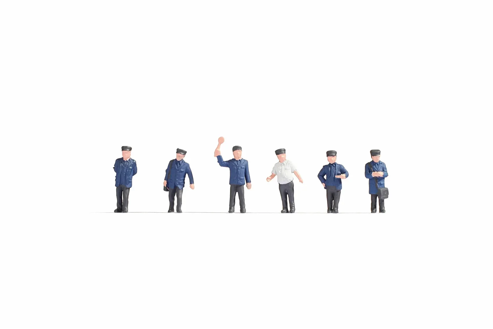 Bahnbeamte in Uniform. Einfach bemalt zum günstigen Preis! Das Set umfasst sechs Bahnbeamte in der typischen Uniform. Die Modellfiguren sind in der Spur H0 (Maßstab 1:87, ca. 2 cm hoch) ausgeführt und haben typische Arbeitshaltungen. Ein Bahnbeamter hält die Kelle, eine Schaffnerin kontrolliert die Fahrscheine, drei weitere Bahnbeamte machen kontrollierende und beratende Gesten, ein Schaffner bläst in die Signalpfeife.. Die Hobby-Figuren sind einfacher bemalt als die „normalen“ NOCH Figuren. Daher sind die Hobby Figuren die erste Wahl, wenn es darum geht Plätze, Dörfer, Städte, Bahnsteige, Parks, Felder, Waggons und vieles mehr preisgünstig zu bevölkern. Die besonders preiswerten NOCH Hobby-Figuren erkennen Sie an der roten Verpackung.