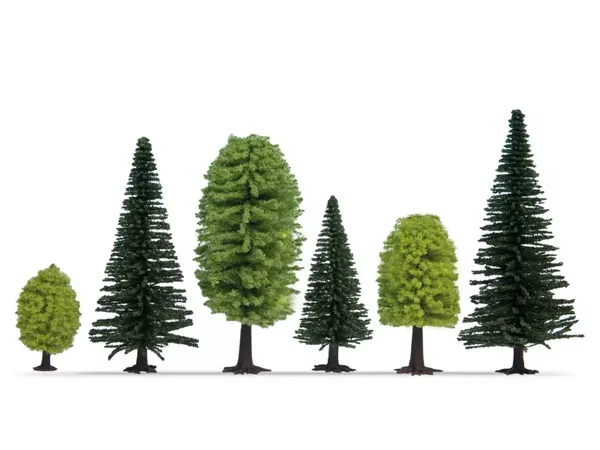 Die Kunststoff-Spritzlinge der Laubbäume sind handkoloriert und mit einem eigens dafür entwickelten, realistischen Flock belaubt. Die Tannen sind mit einem speziellen, naturgetreu wirkenden Nadelflock versehen.