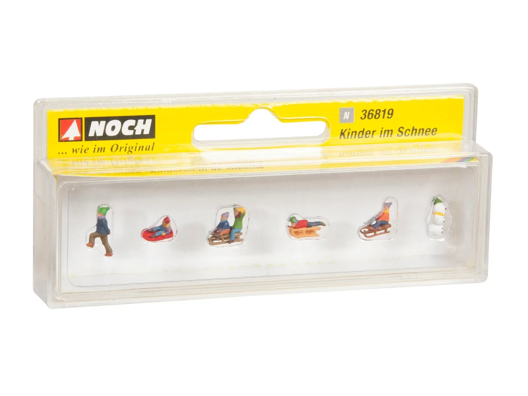 Das Set für die Spur N (Maßstab 1:160, ca. 1,1 cm hoch) enthält sechs Kinder, vier Schlitten und einen Schneemann.