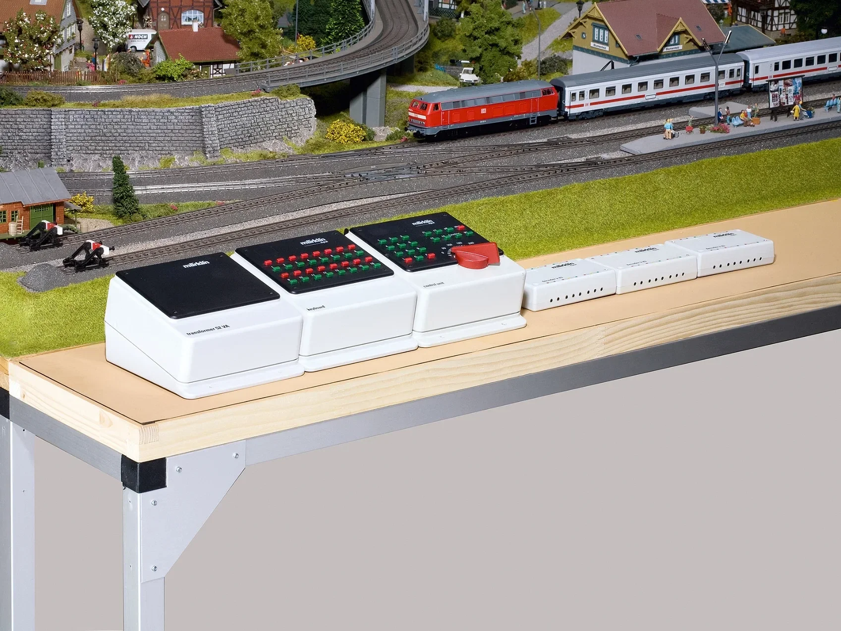 Mithilfe der Trafo-Anbauplatte können Sie Transformatoren, Stellpulte und Schalter griffbereit vor Ihrer Anlage anbringen. Die Anbauplatte sind unter anderem für den Anbau an jedes NOCH Fertiggelände oder an Ihre individuelle Anlage geeignet.
