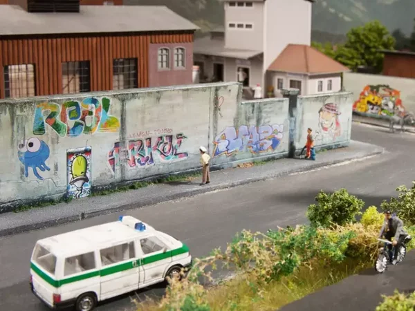 Die 3D-Kartonplatte “Industriewände” eignet sich ideal, um Stadtszenen noch realistischer zu gestalten. Bringen Sie den neuen, kunstvollen Trend der Wandgestaltung auf die Modell-Landschaft. Mit der Graffiti-Wand lassen sich öffentliche Wände wie an Bahnhöfen, Stadtmauern und Skaterparks sehr detailgetreu ausgestalten.