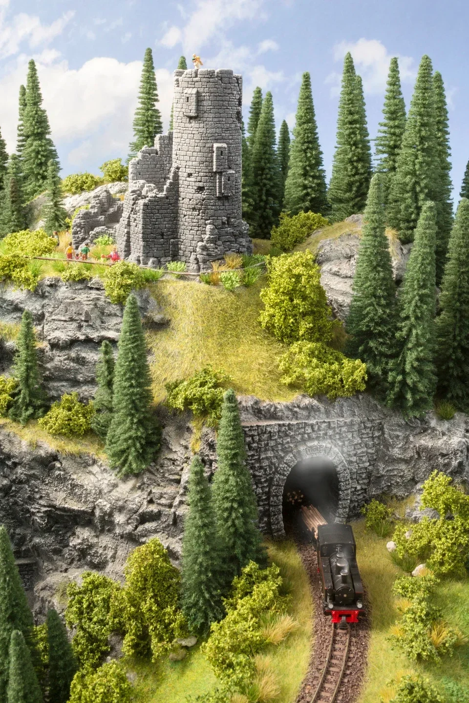 Gibt es ein eindrucksvolleres Highlight auf einer Modelleisenbahnanlage als eine imposante Burgruine, die hoch oben auf einem Felsen tront? Wir denken nein!